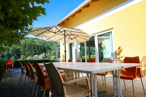 Genießen Sie die frische Luft und die malerische Aussicht auf unserer geräumigen Terrasse. Ein idealer Ort für gesellige Treffen, Entspannung und den perfekten Genuss im Freien.